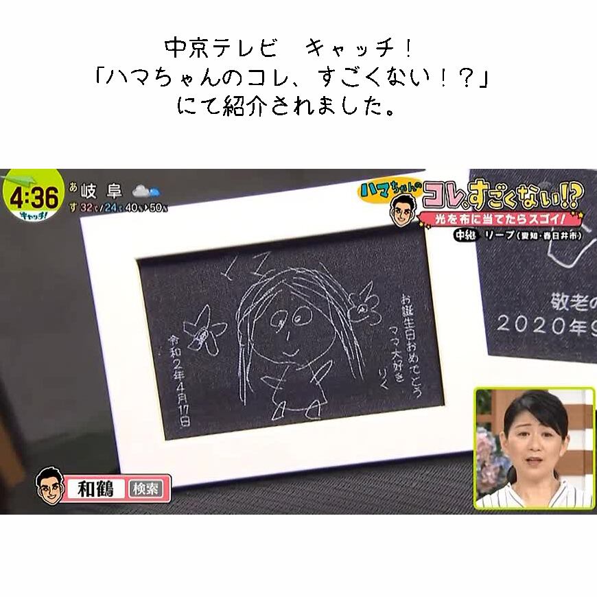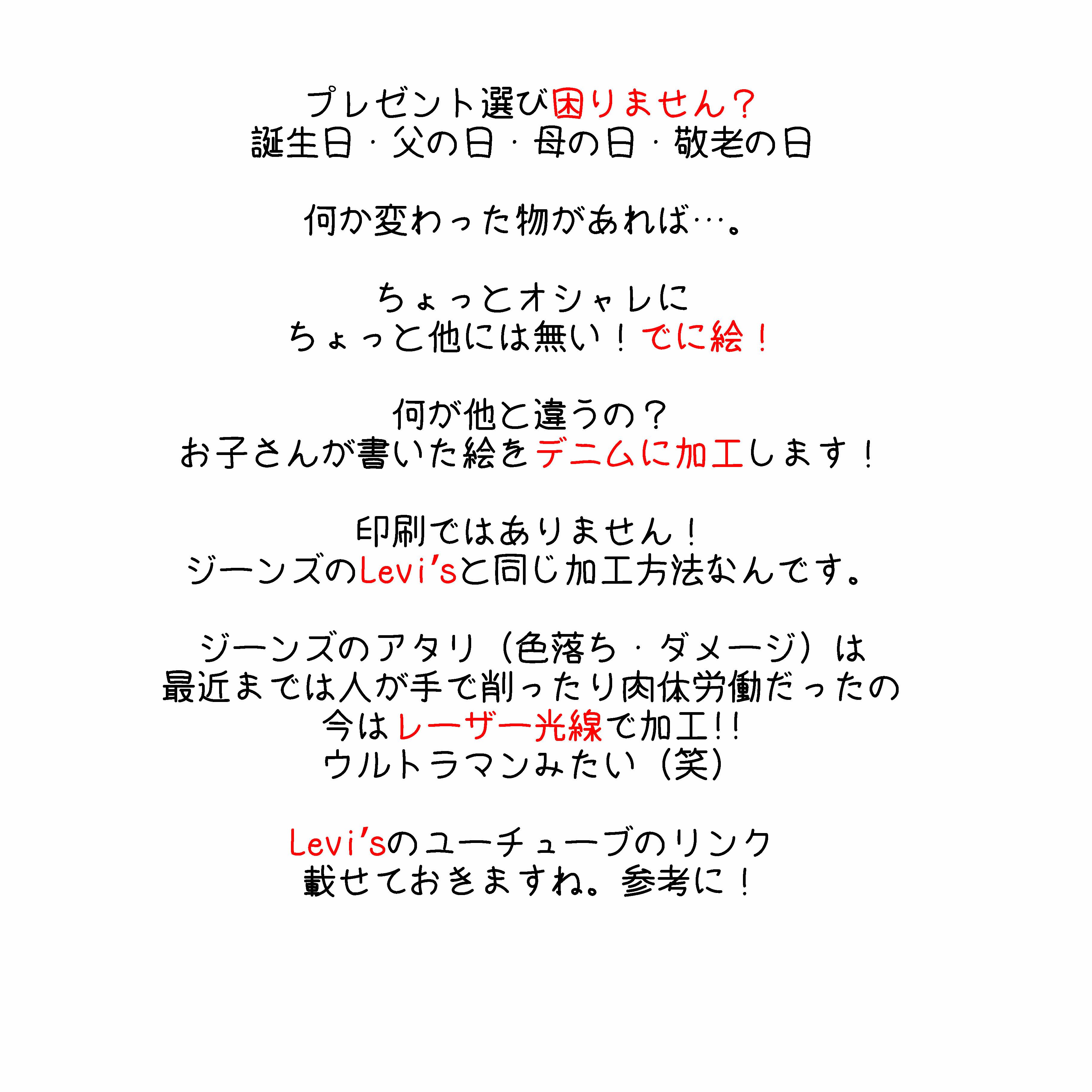 お子さんやお孫さんからの似顔絵(線画のみ)をデニム生地にレーザー加工して、額縁に入れたプレゼントは如何でしょうか?